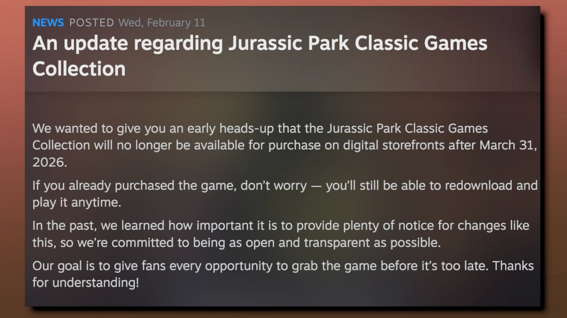 Po dwóch latach od premiery, 7 klasycznych gier z cyklu Jurassic Park zniknie ze sprzedaży z cyfrowych sklepów gigantów gamingu.